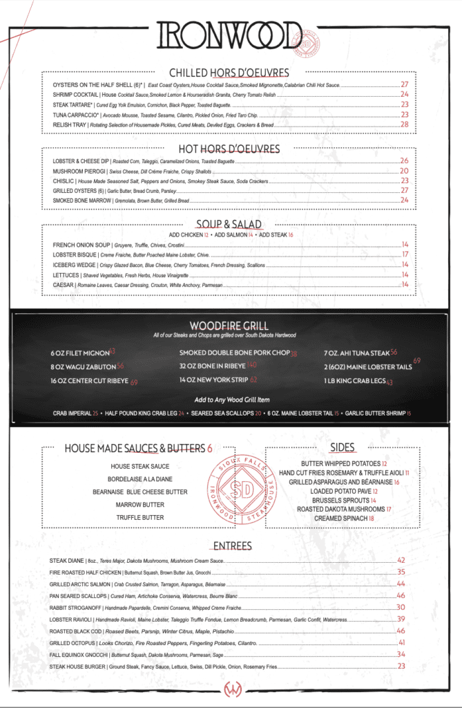 On the wood-fire grill, all the steaks and chops are grilled over South Dakota hardwood and can be paired with a selection of housemade sauces and butters.
