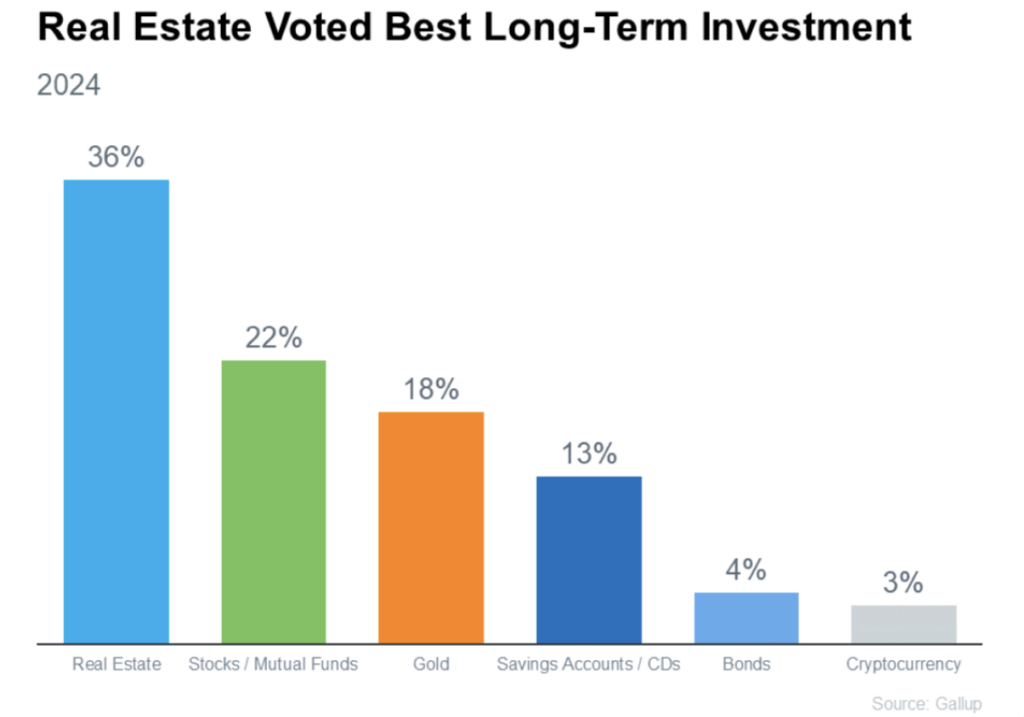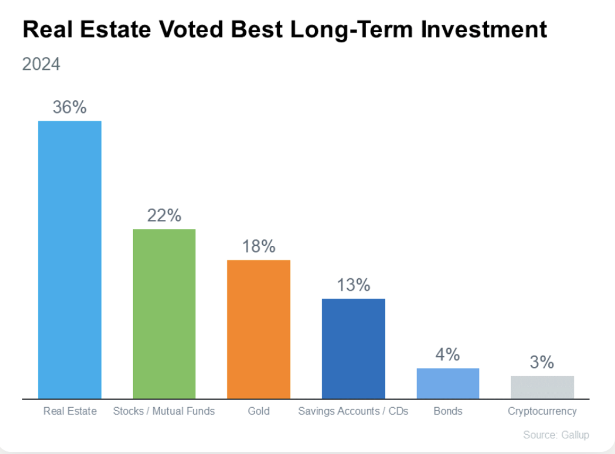 According to the experts at Gallup, real estate has been crowned the top long-term investment for a whopping 12 years in a row. It consistently has beat other investment types like gold, stocks and bonds. This enduring trend speaks volumes about the stability and wealth-building potential of real estate.