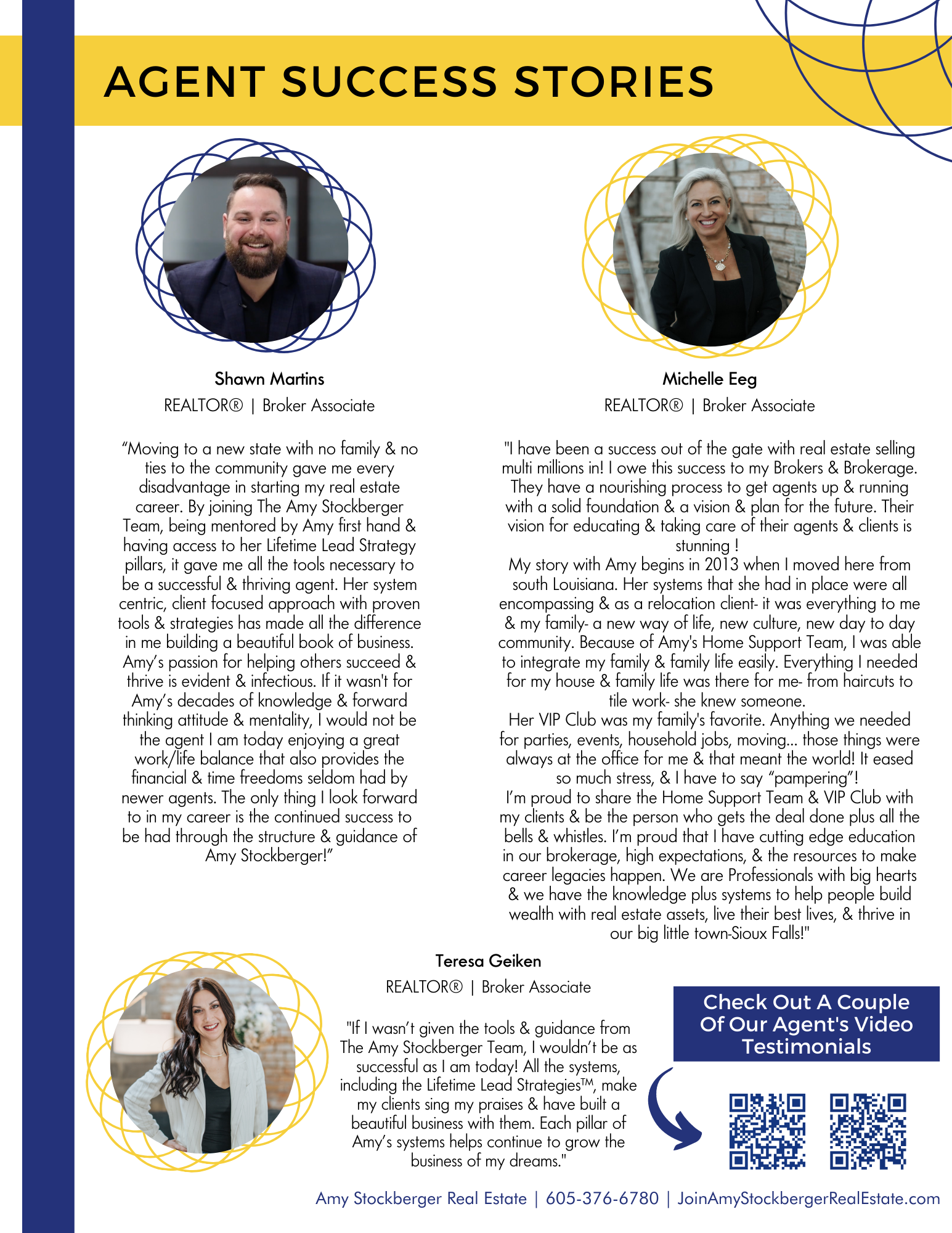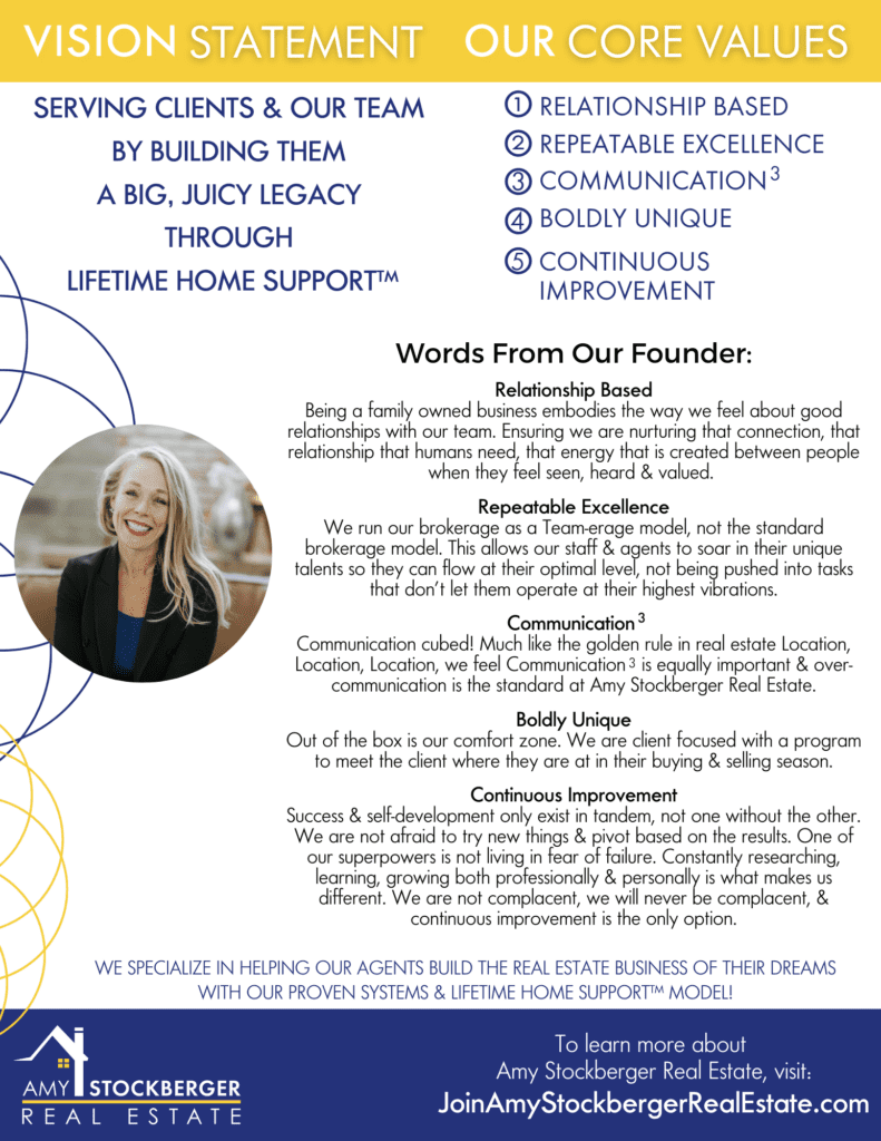 At Amy Stockberger Real Estate, we believe in empowering our agents to achieve their fullest potential by providing them with the essential pillars of success. Our proven model and innovative approach is designed to help our agents elevate their careers and build big, beautiful businesses that provide them with the personal, financial, and time freedom they deserve.