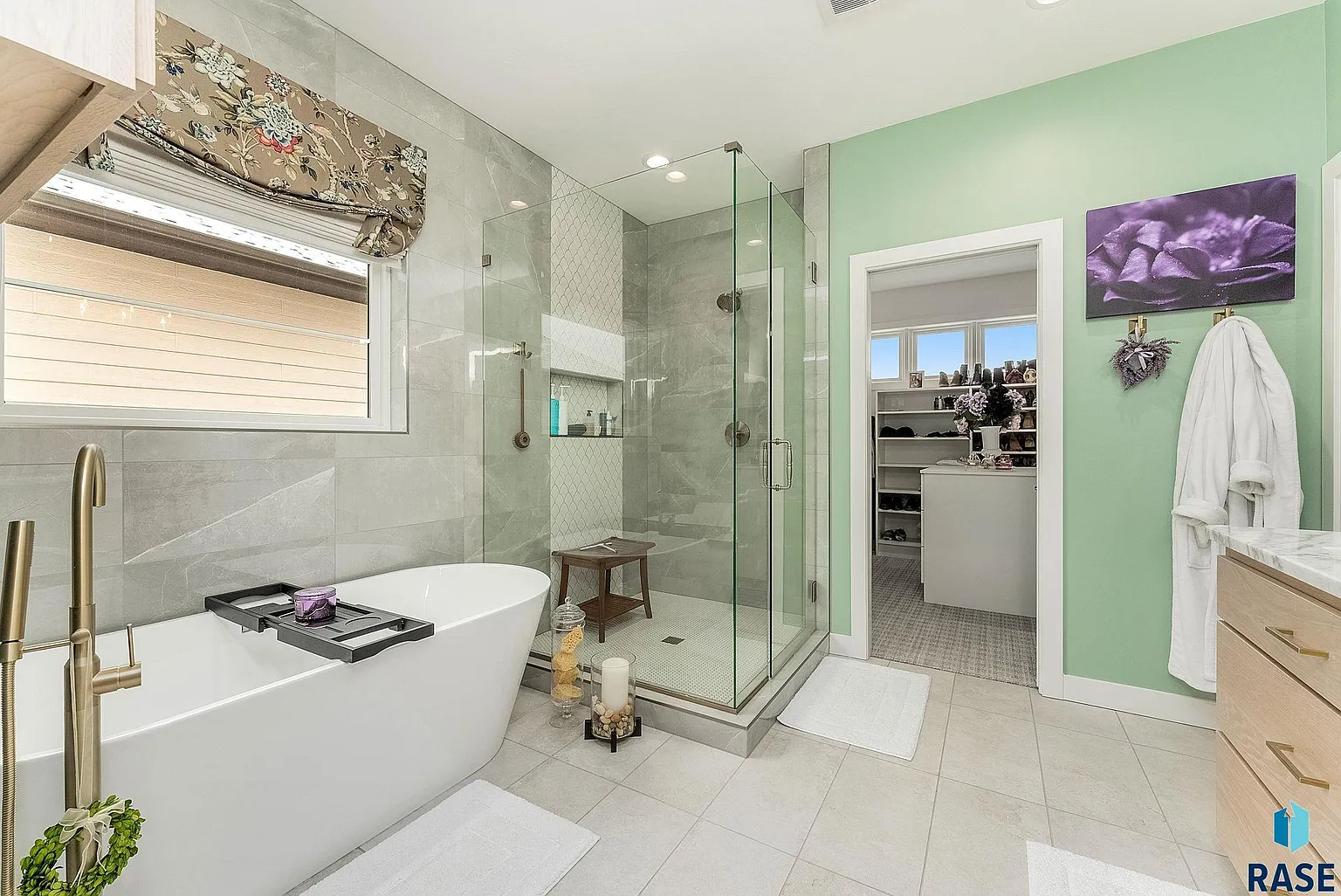 The main-floor primary suite is a standout space, with a large walk-in closet, island for additional storage, custom-tiled wall and spa-inspired en suite bath.