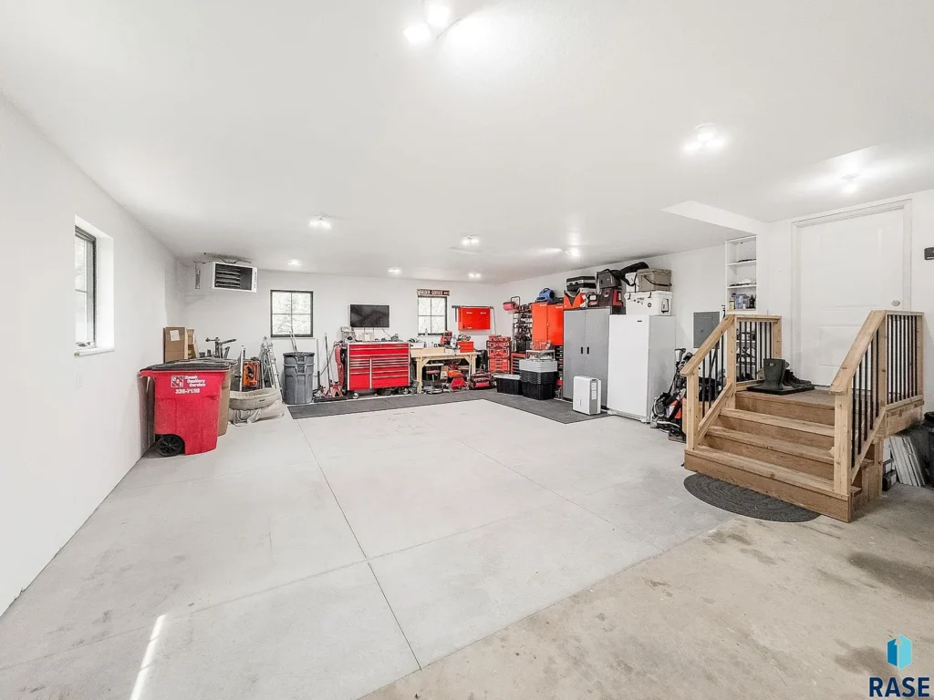 A substantial 22-by-23-foot core-floor space offers bonus storage, while the four-stall heated garage includes a drain and water hookups.