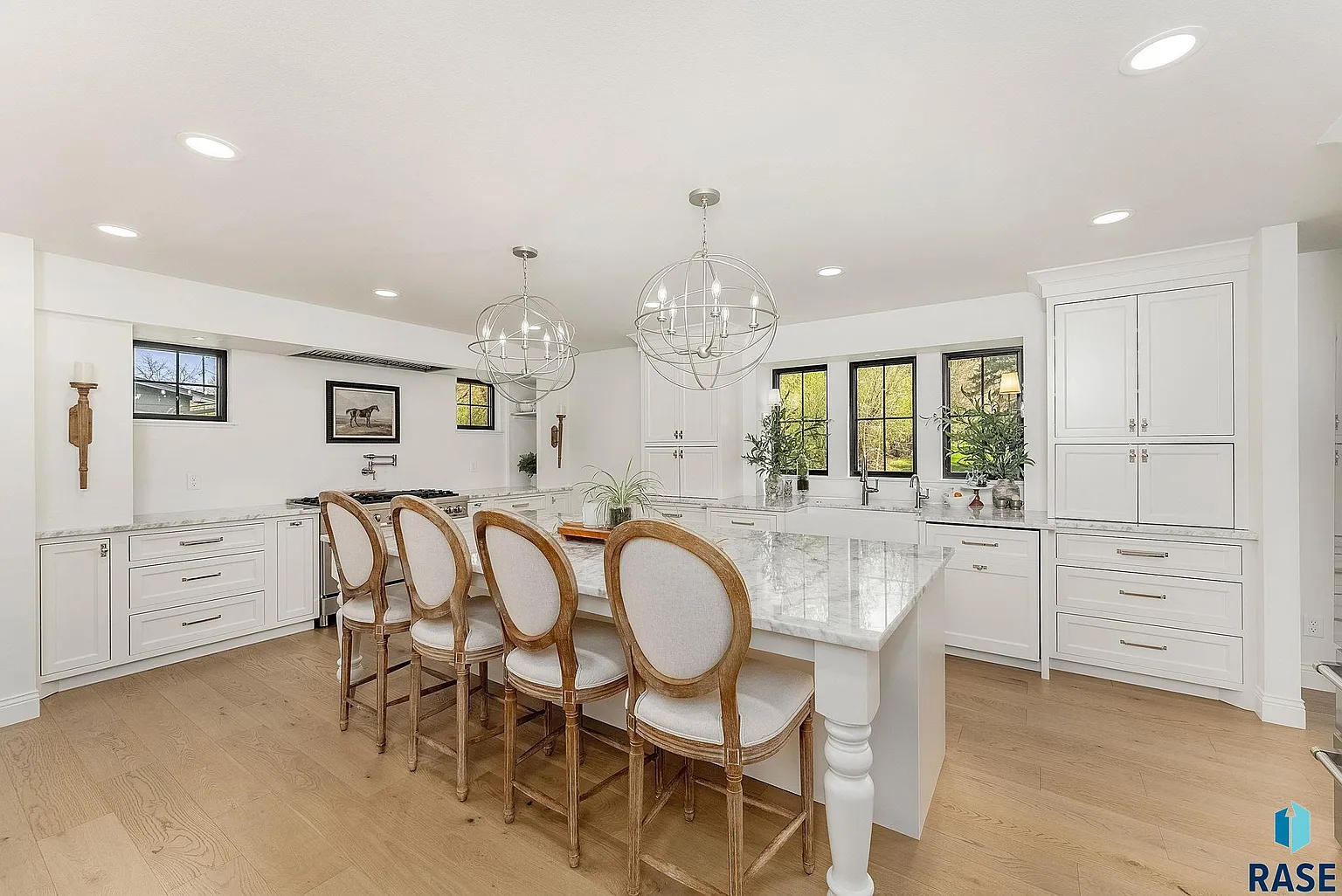 An extraordinary kitchen is outfitted with high-end commercial-grade ZLINE appliances, a massive marble island, spacious walk-in pantry and elegant engineered white oak hardwood flooring.