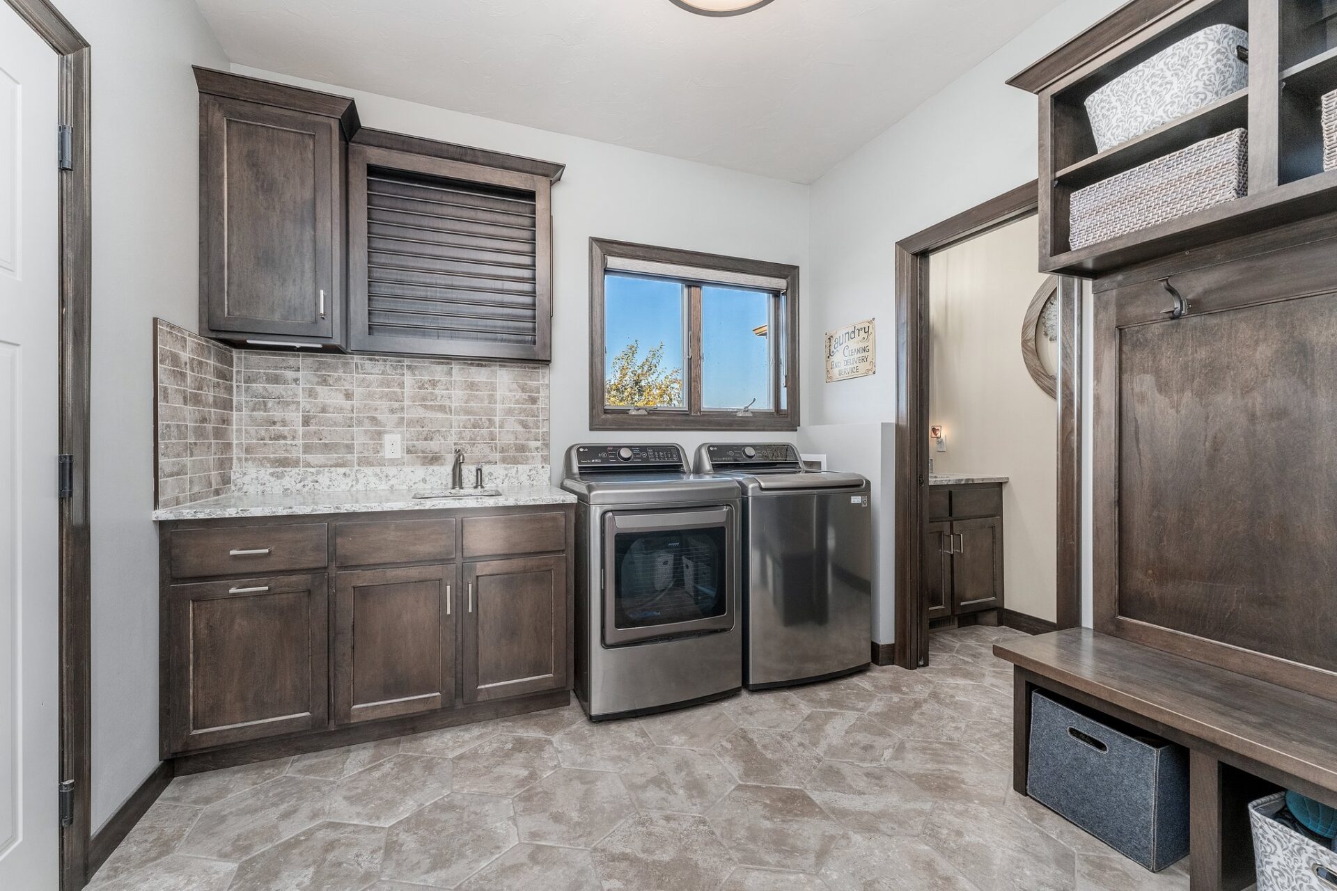 The convenient main-floor layout includes a well-placed laundry and mudroom, plus a half-bath, between the garage and kitchen. The space offers an entry bench and hooks, along with cabinets perfect for shoes and everyday items.