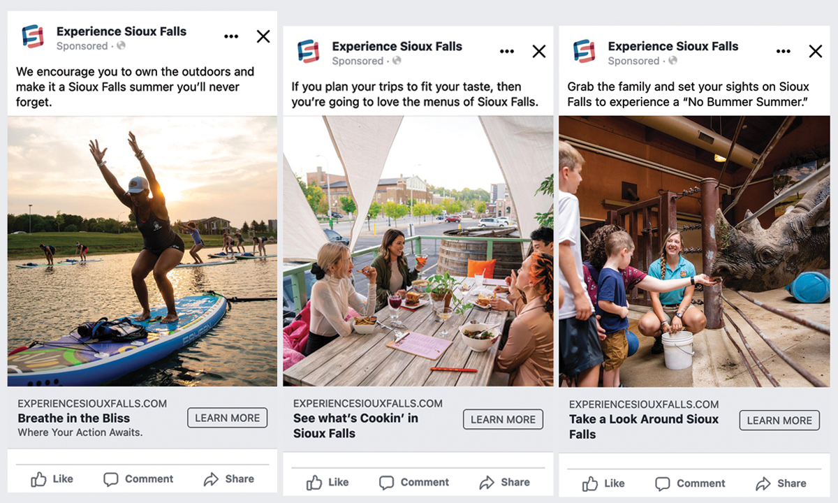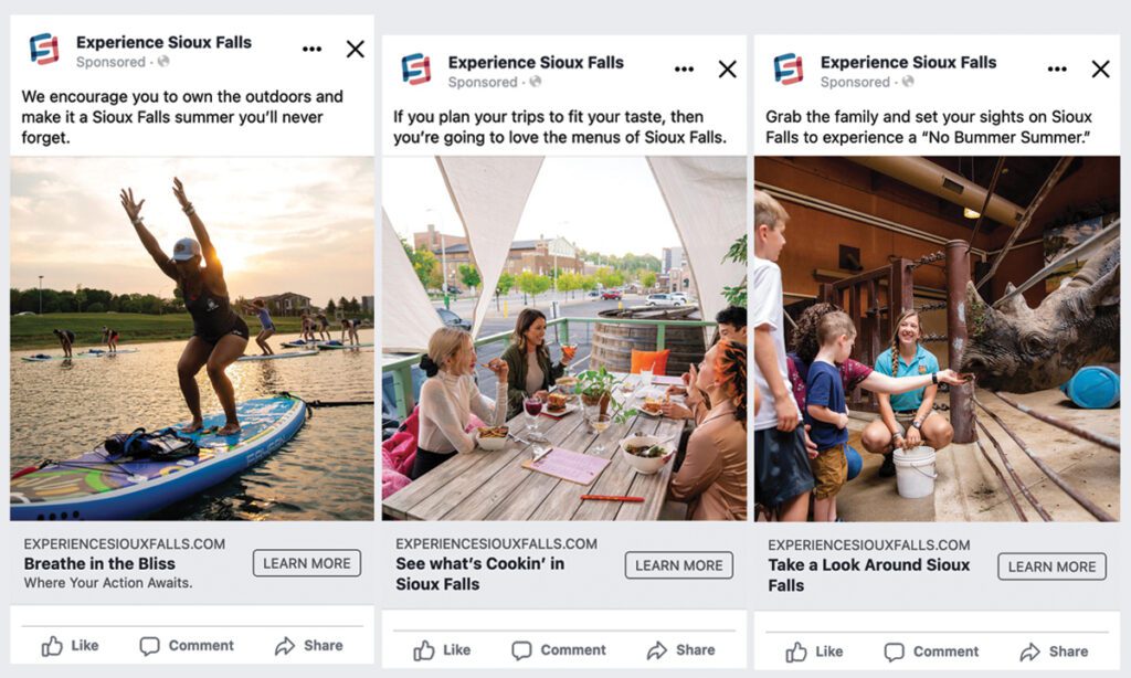 A variety of digital tactics will be used to guide users through the travel planning process, ultimately leading them to book a vacation in Sioux Falls during the peak travel season. Persona-specific creative executions will be incorporated throughout all advertising tactics whether people are traveling for art, music, outdoor, food or family experiences.