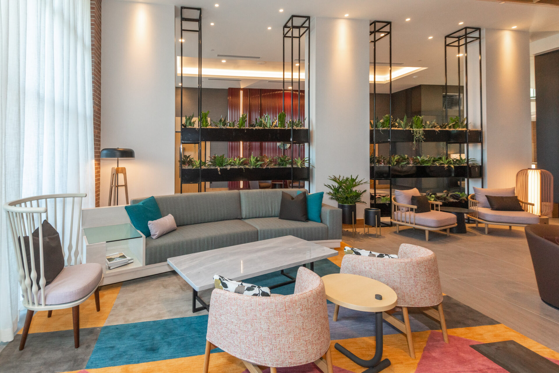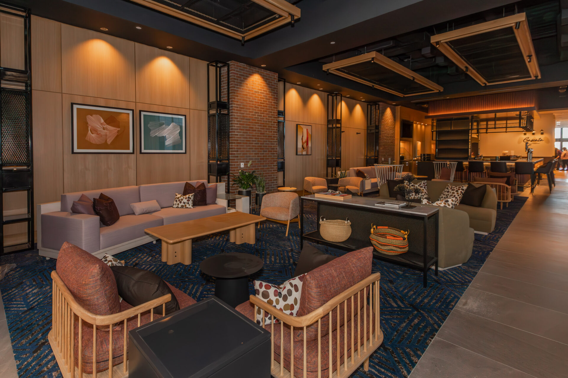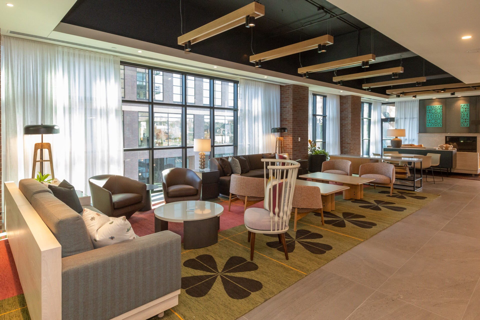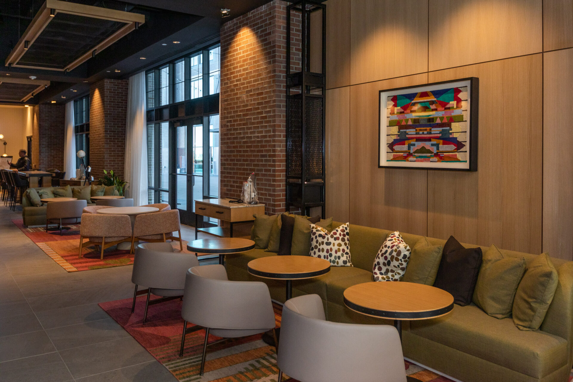 The balance of the hotel’s main level includes multiple common seating areas, which are open to the public, while the second level offers additional gathering spaces.