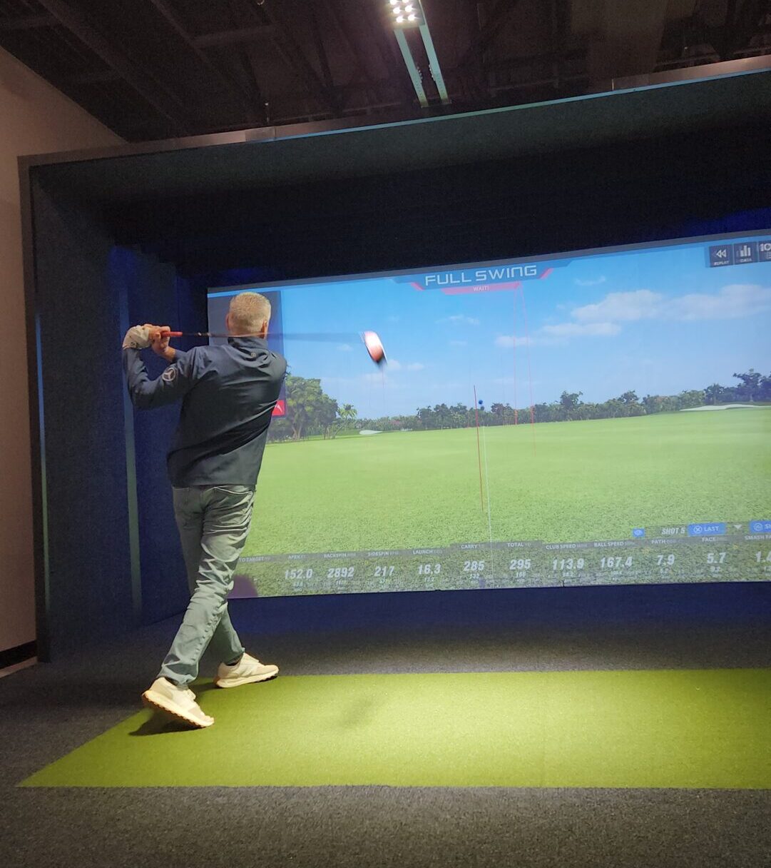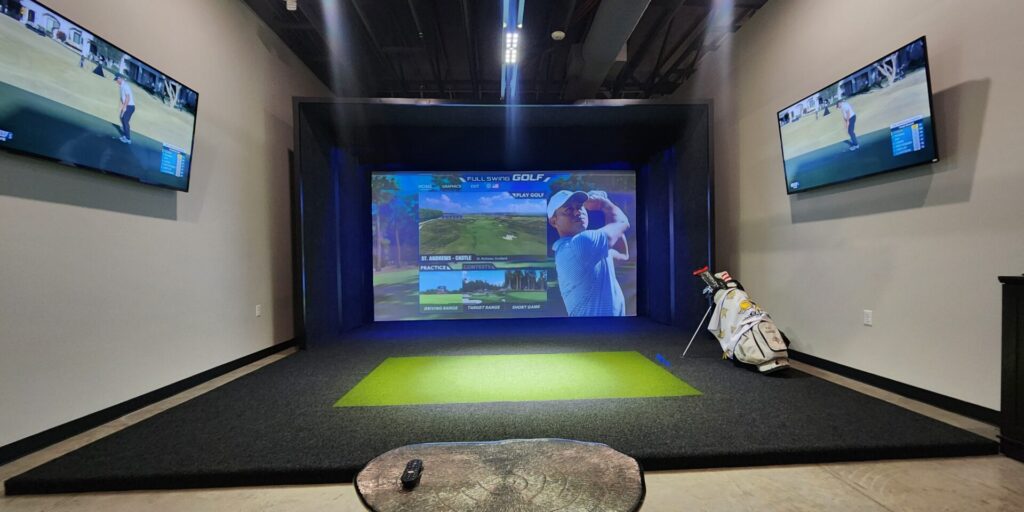 The space includes two simulator suites. The wide-screen simulators come from the Full Swing Pro Series, which features infrared technology — using 688 infrared sensors across two tracks — to measure the ball mid-flight at the speed of light.