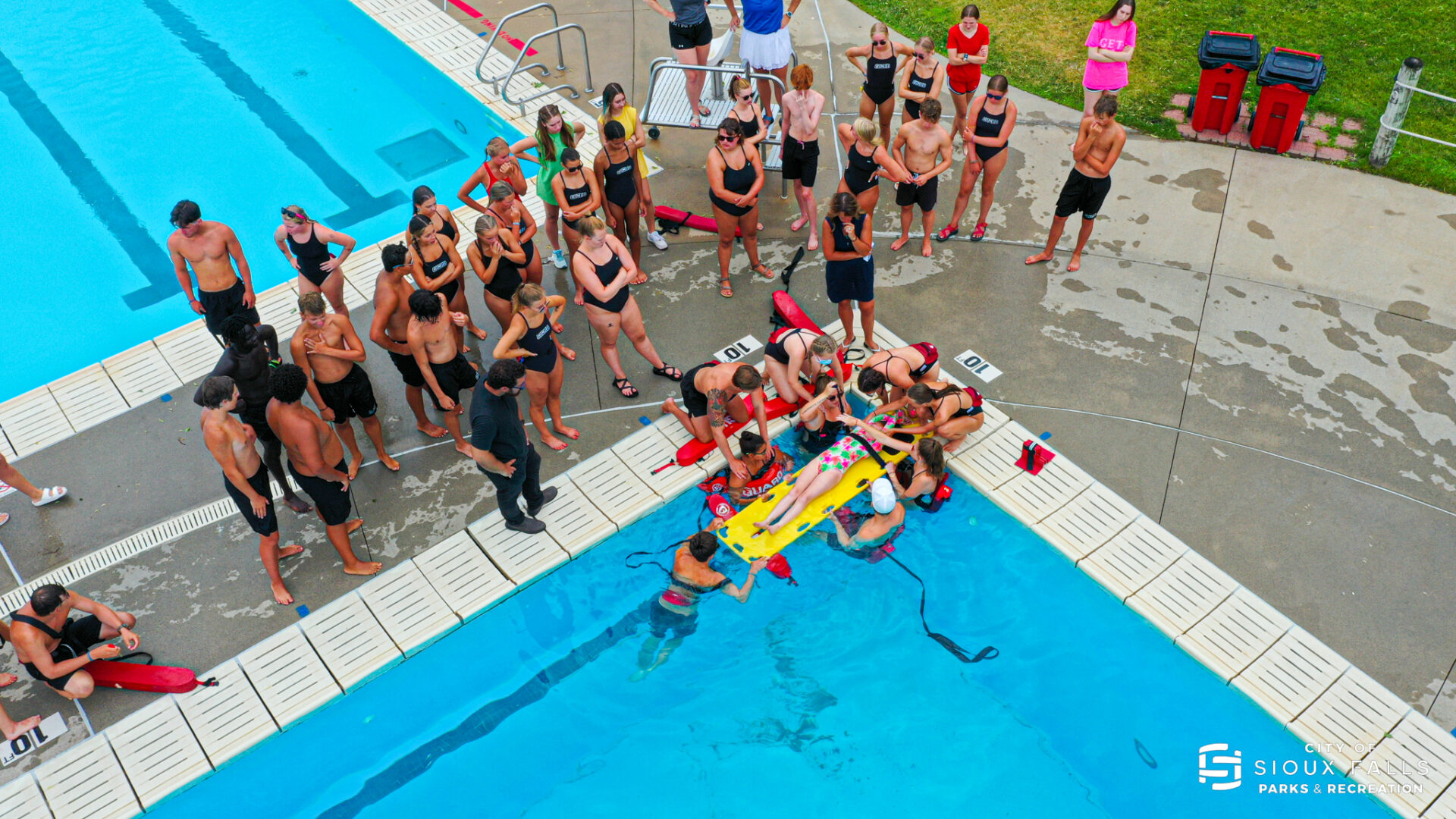Lifeguards train at a Sioux Falls pool.