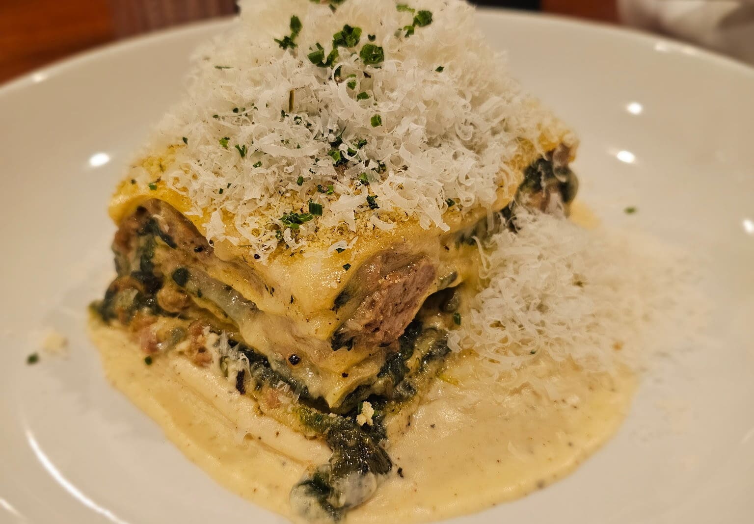 The featured lasagna is made with roasted cauliflower bechamel, Prairie Coteau lamb sausage, spinach, fontina, provolone piccante and lemon pangrattato.