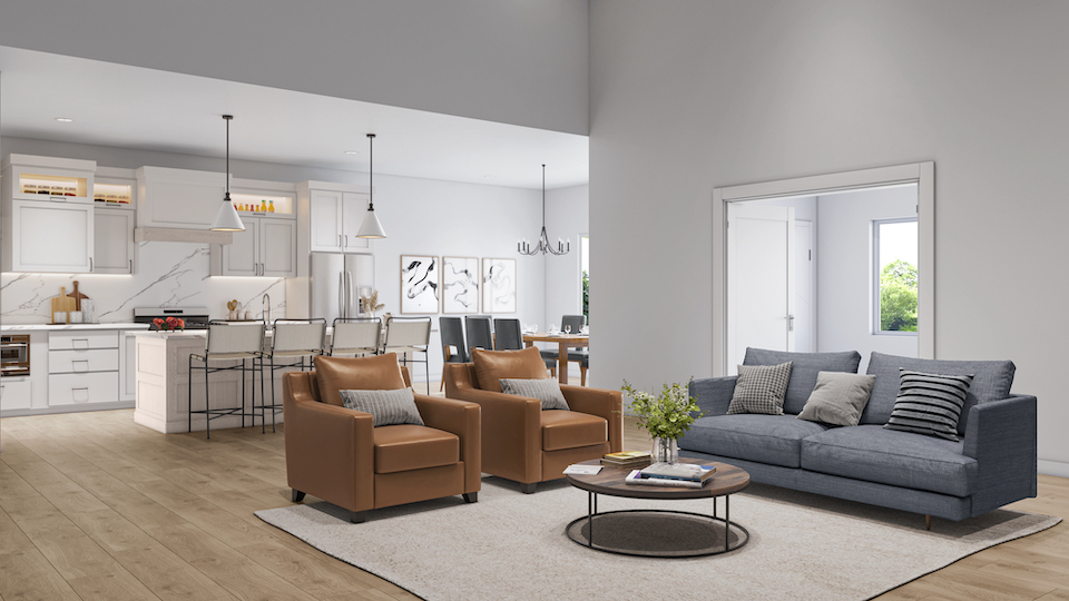 - Details: 2,316 square feet, three bedrooms, two bathrooms, three-stall garage, pocket office, sunroom, 16-foot ceiling in living room, 9-foot island in kitchen, primary suite with vanities and WIC, four-season room, private covered patios.