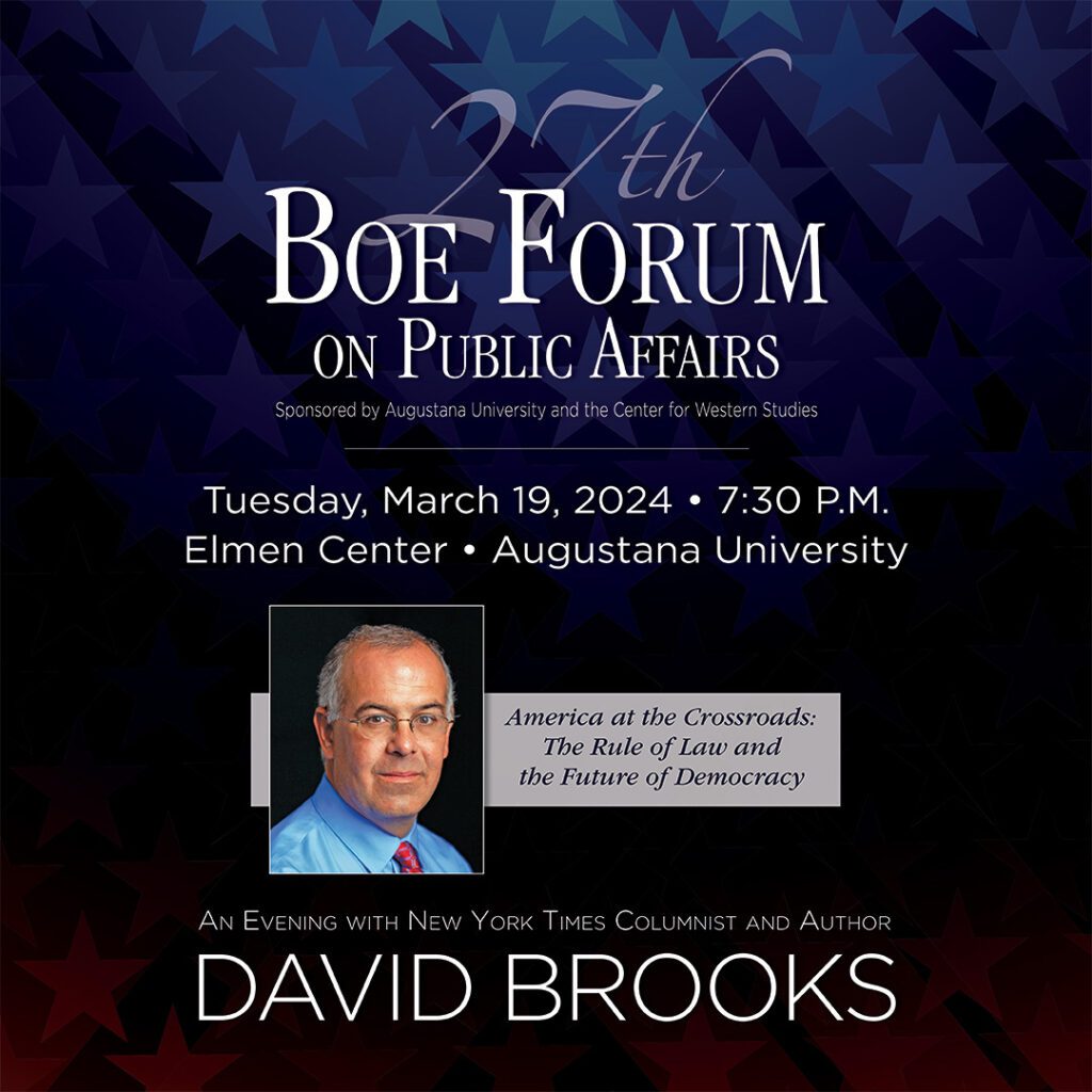 The rule of law and the future of democracy will be the focus of Augustana University’s 2024 Boe Forum on Public Affairs, featuring The New York Times columnist and bestselling author David Brooks.