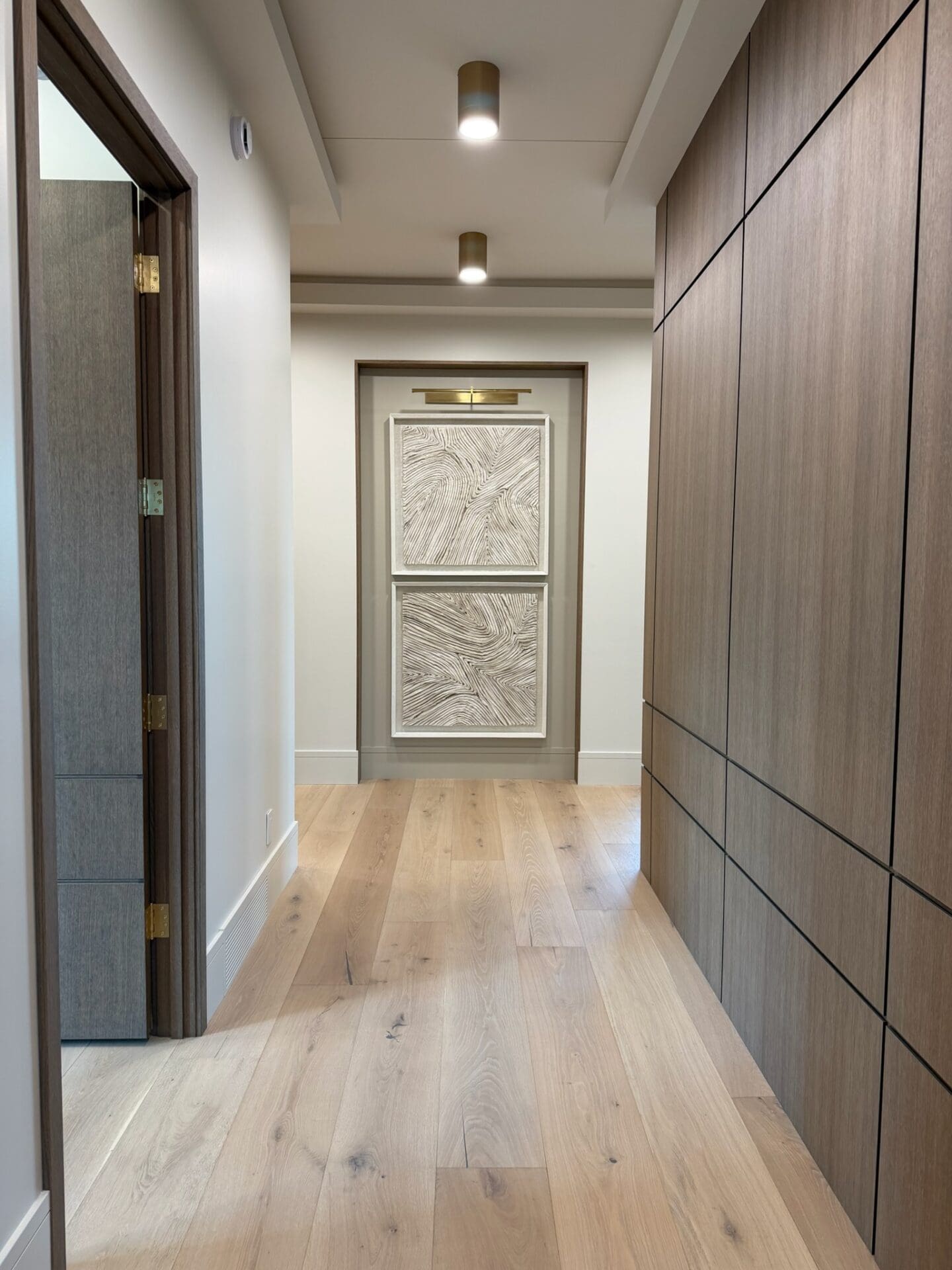 Custom white oak kitchen cabinetry, natural stone and quartzite countertops and modern wood panel walls conceal hidden entries for a clean, minimalist look.