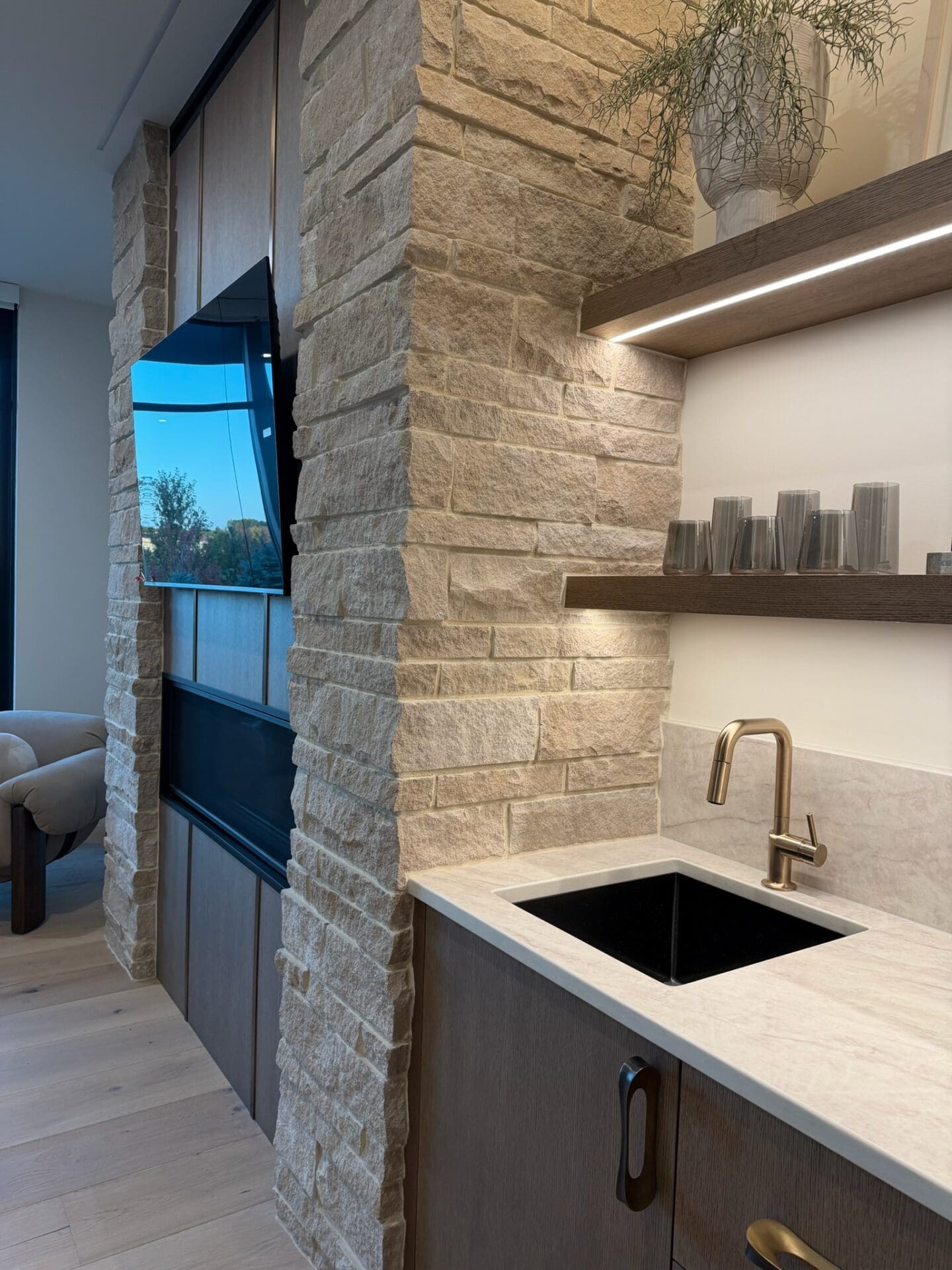From the moment you step inside, natural wood tones and limestone accents set the tone for a cohesive design that flows from interior to exterior.