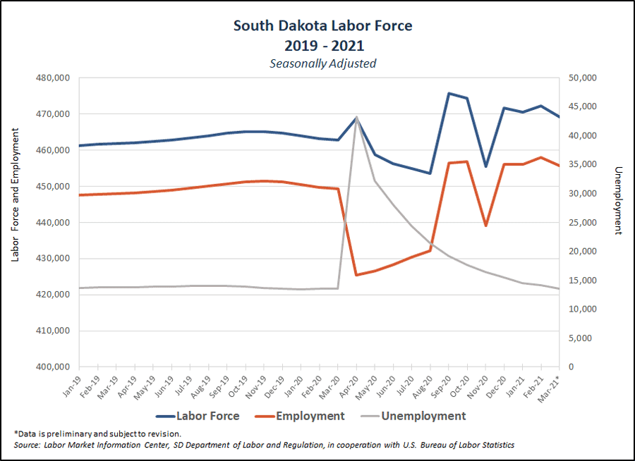 The jobless rate fell to 3 percent from 3.2 percent, according to statistics from the South Dakota Department of Labor and Regulation. One year ago, the rate was 3.1 percent. While businesses began to lay off workers in March 2020 because of the coronavirus pandemic, the jobless numbers weren’t reflected until the April report, which set a record rate of 10.5 percent.