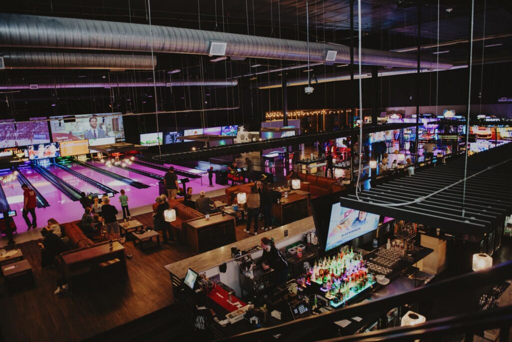 A variety of people come to Union Social. You might find kids celebrating at a birthday party, teenagers playing video games in the arcade, friends throwing axes or enjoying appetizers and drinks, families bowling on the 12 full-size lanes, couples eating dinner or employees of a business having meetings and doing team-building activities.