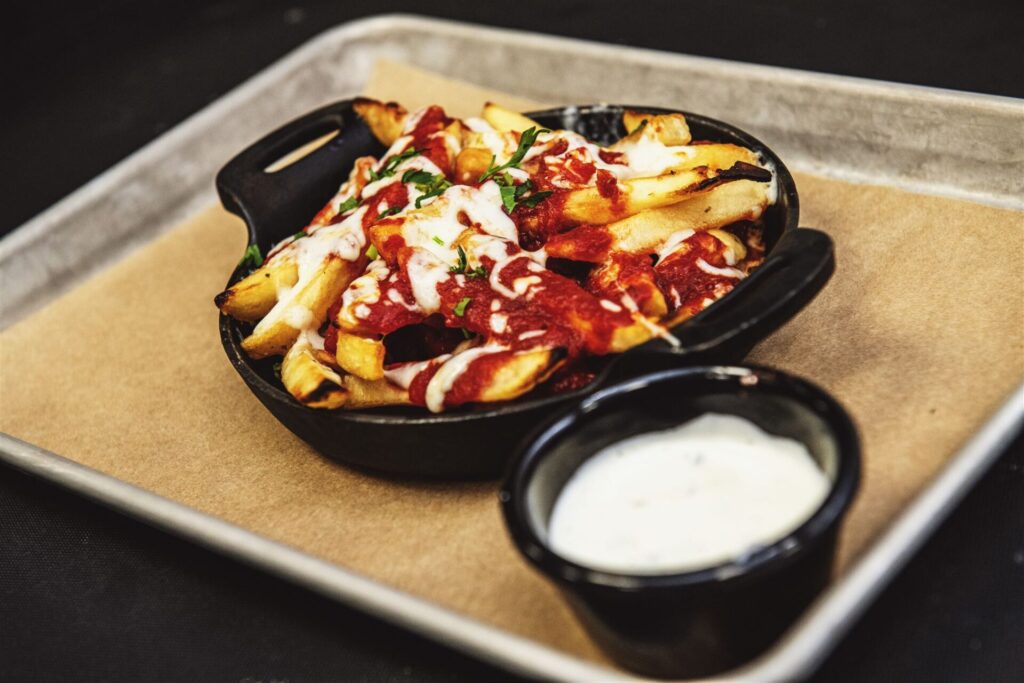 New skillet fries are tossed with garlic Parmesan seasoning and topped with marinara and mozzarella before going into the pizza oven “just to get a nice little melt.” They’re sprinkled with Parmesan and fresh parsley and served with crema for dipping.