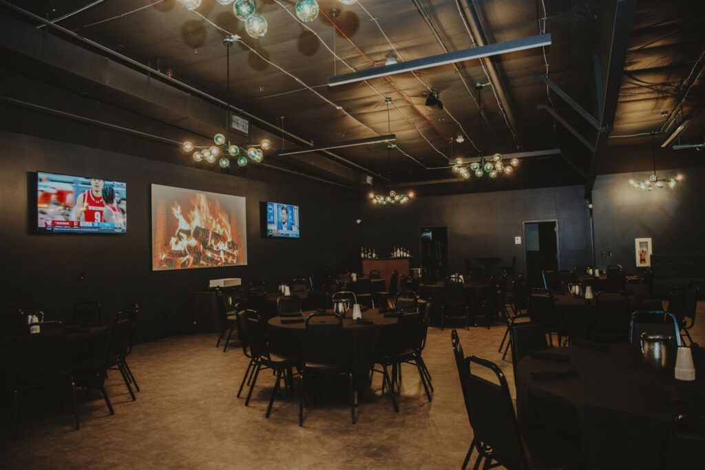 Several spaces can be rented. On the mezzanine, there are two birthday party/meeting rooms and a large space overlooking the activity on the main floor that can seat 100 guests. Near the axe-throwing area, there’s an indoor patio with picnic tables and artificial hedges that can divide the space for separate groups.