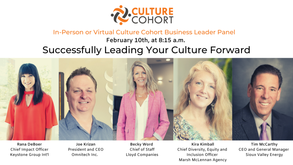 The Culture Cohort event will be Feb. 10 from 8:15 to 9:30 a.m. at Southeast Tech and will help define what culture really means – along with how to invest in it in ways that retain a healthy workforce and enhance business performance.