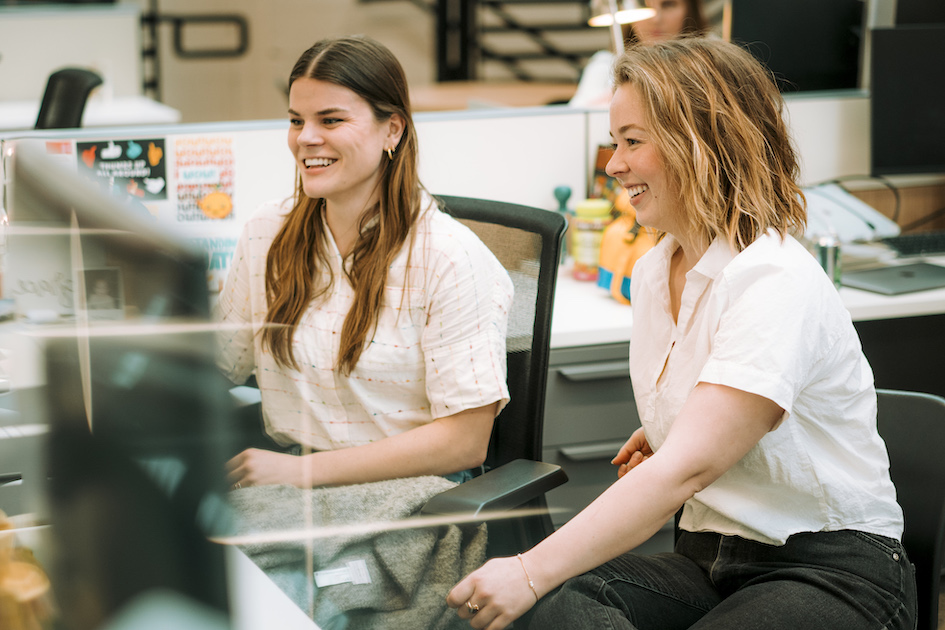 Maddie Mack, associate director of content, and Emily Larson, account executive, collaborate at Lemonly’s headquarters in downtown Sioux Falls.