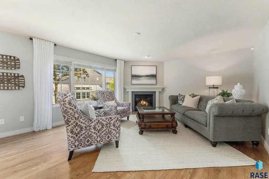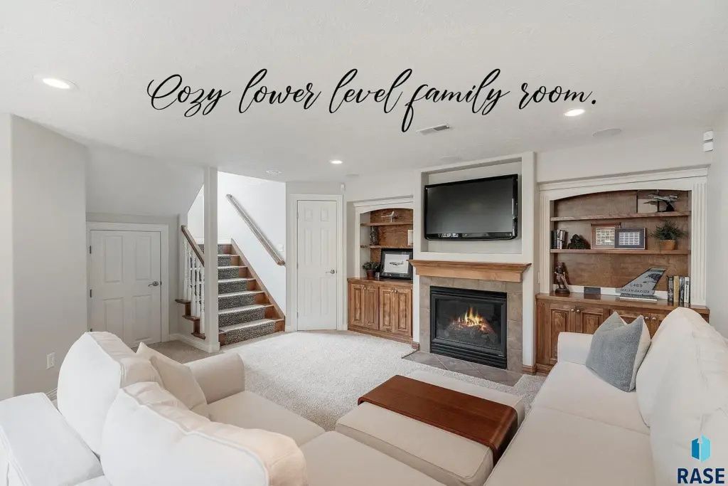 The lower level includes additional living space, with a second fireplace and plenty of space for guests or a home office.