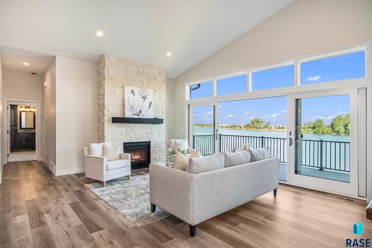 The living room delivers floor-to-ceiling sliding windows, vaulted ceilings and a gas fireplace.