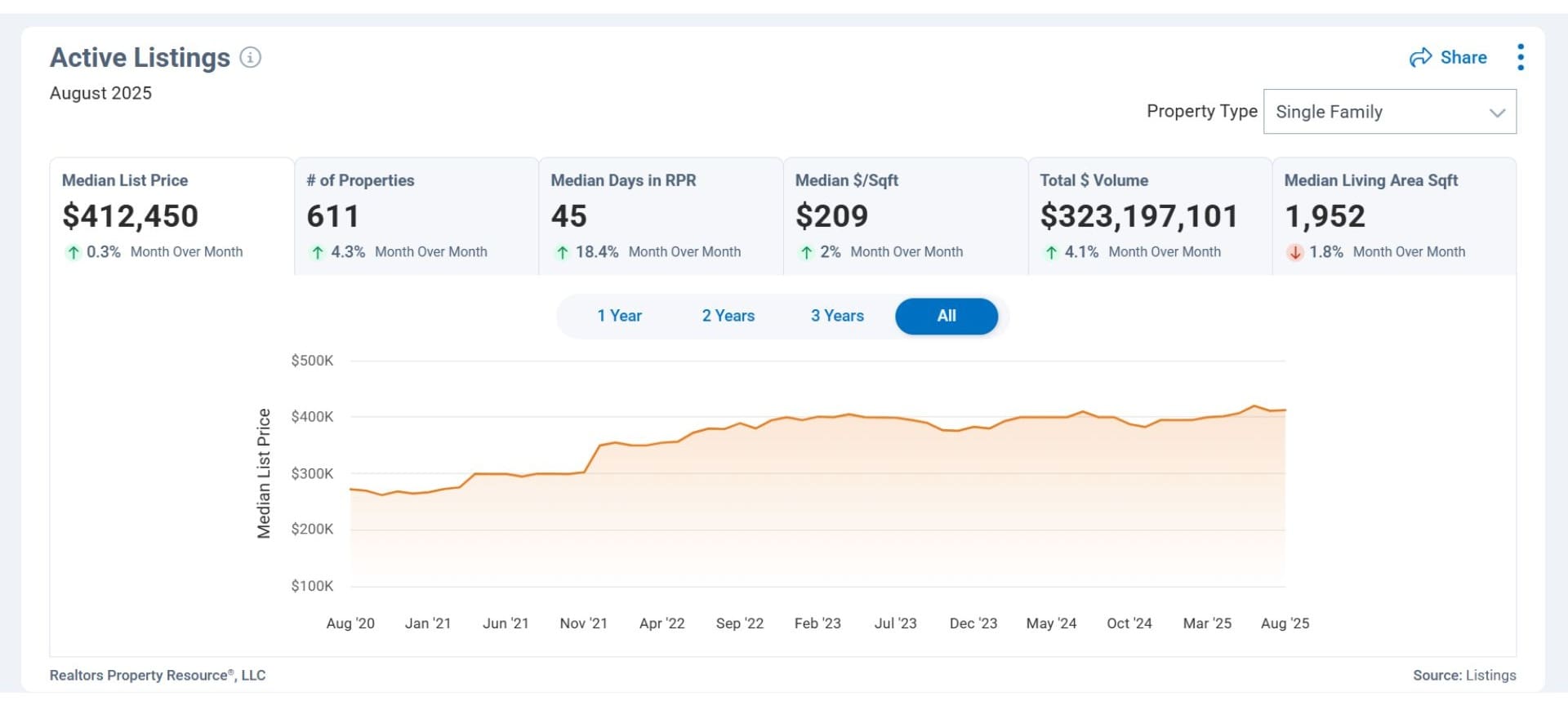• Median list price for active listings (August 2025): $412,450, up 0.3 percent month-over-month