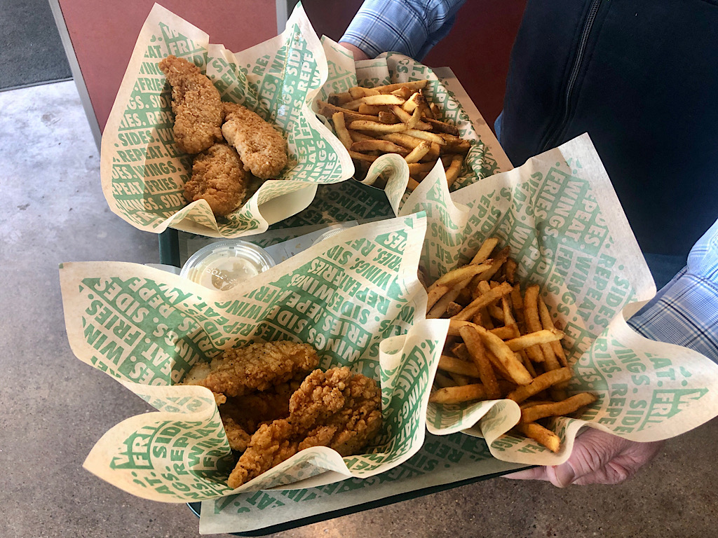 Wingstop serves bone-in and boneless wings with 13 flavors of varying spiciness, chicken sandwiches that are tossed in sauce and tenders with a dipping sauce.