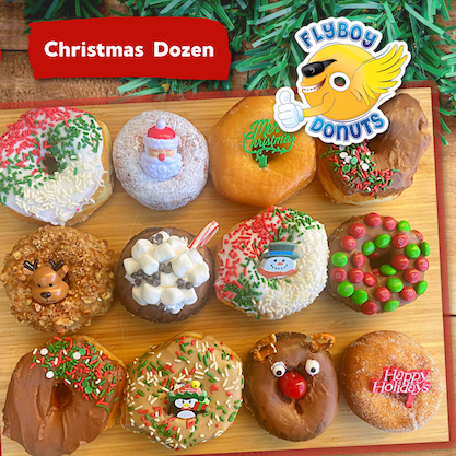 “Orders for Christmas specials just need to be in anytime before 10 p.m. for next-day pickup or delivery,” Flyboy owner Ben Duenwald said. “We also offer same-day delivery of a variety of baker’s dozen choices.”