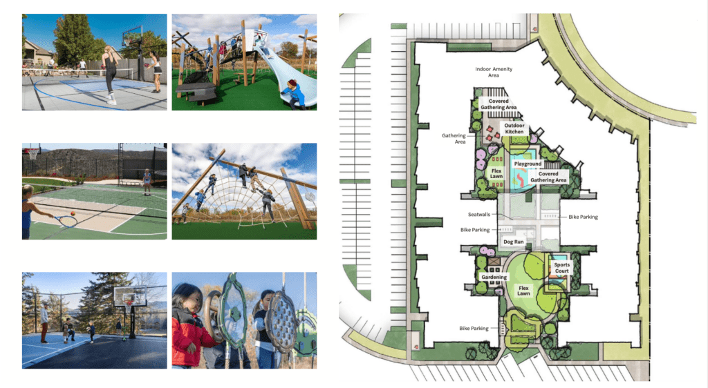 “We’ve got a really awesome interior courtyard that includes pickleball and a multisurface court, and we have a tot lot — two playgrounds — some covered areas, a fitness room and a bike repair shop to round it out,” Tobin said. “Our focus is really building a family build and focusing on the kids.”