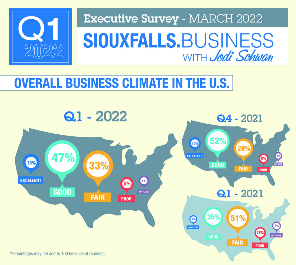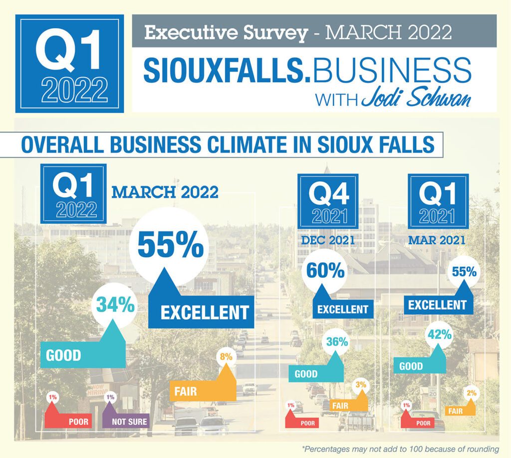 Nearly nine in 10 CEOs rate the overall business climate in Sioux Falls as good or excellent, which is somewhat weaker than the 96 percent that said the same three months ago.