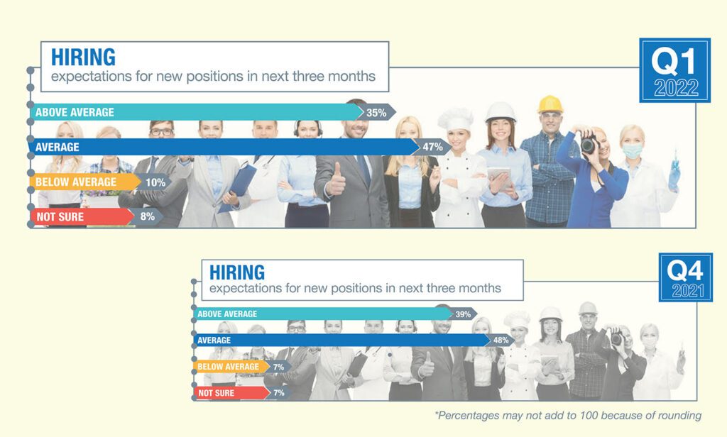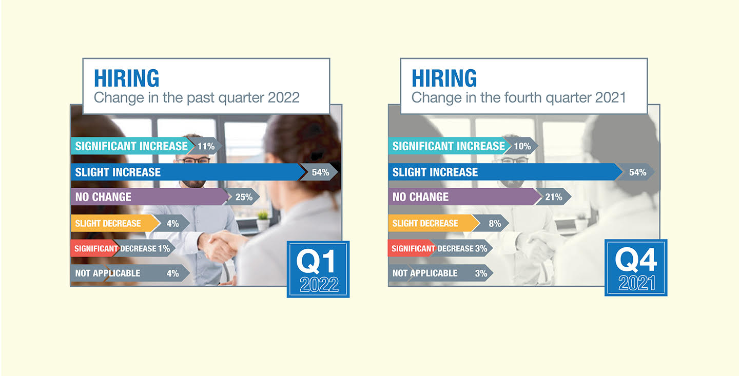 Hiring in Sioux Falls in the first quarter appears more or less on par with the previous quarter, with 65 percent reporting a slight or significant increase in hiring, compared with 64 percent three months ago.