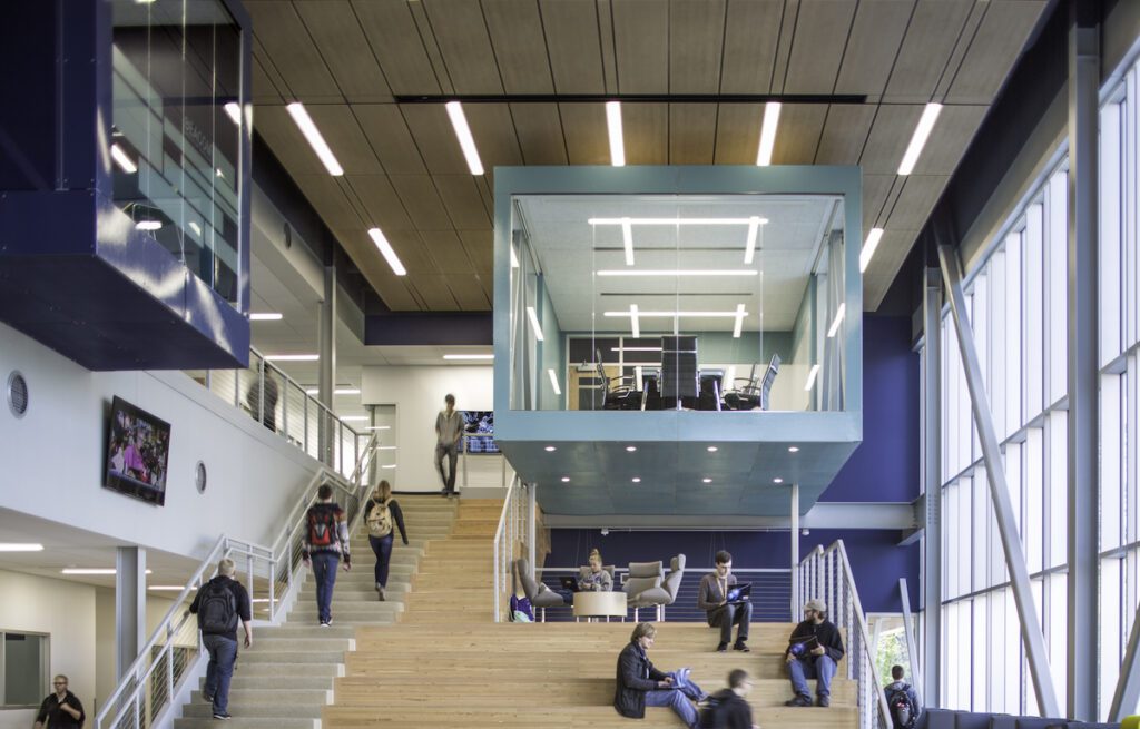 Flooding spaces with natural light, increasing the connection to nature and encouraging stair use and movement is shown here with TSP’s work at the Dakota State University Beacom Institute of Technology.