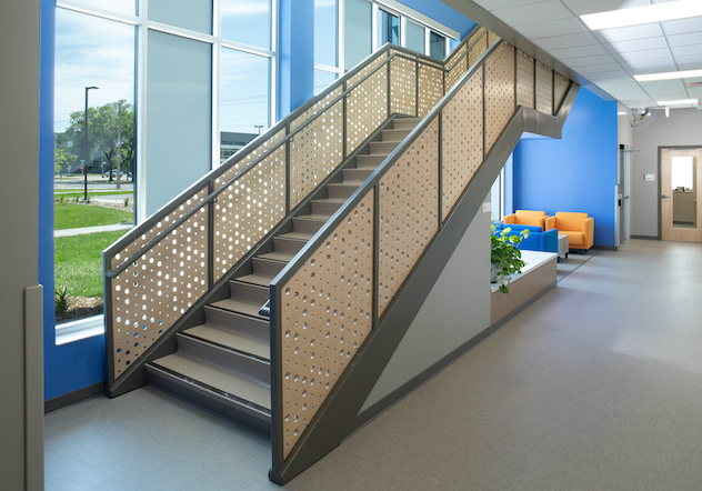 Design of attractive and open staircases encourages movement, shown here with TSP’s work at the South Dakota School for the Blind and Visually Impaired.
