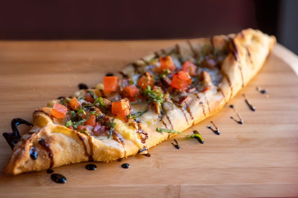 The pheasant pide is made with pheasant cognac sausage, shoulder bacon, alfredo, fontina, tomatoes, hydo basil and smoked barrel-aged balsamic.