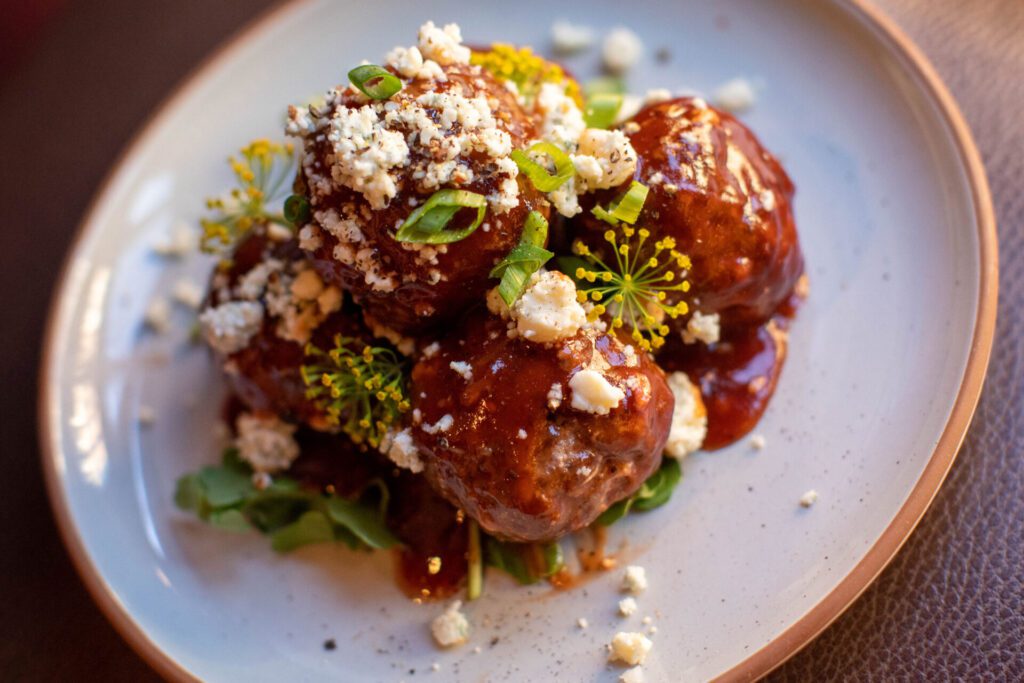Buffalo meatballs feature South Dakota buffalo, slab bacon, smoked blue cheese and raspberry barbecue sauce.